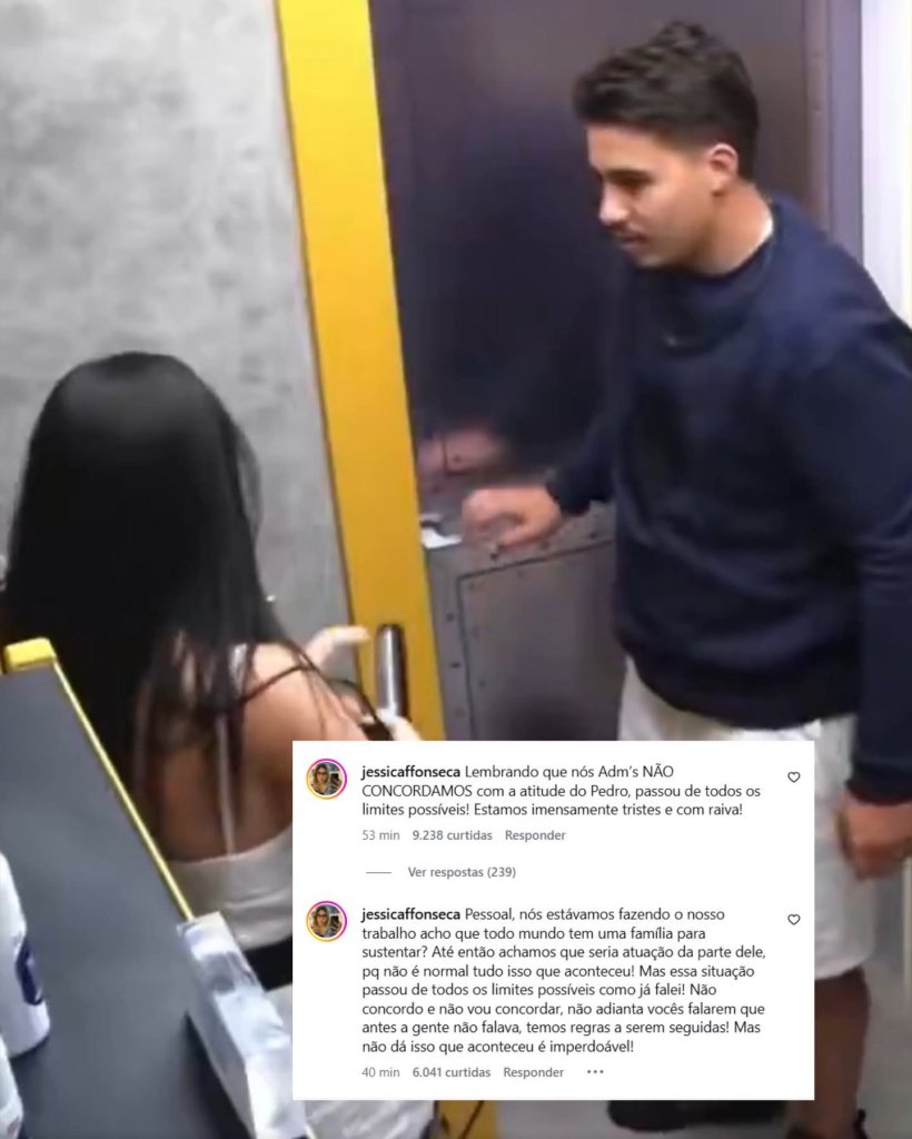 Nos comentários do Instagram do brother, a administradora Jéssica Fonseca reforçou o posicionamento da equipe: “Pessoal, nós estávamos fazendo o nosso trabalho. Acho que todo mundo tem uma família para sustentar. Até então, achamos que poderia ser atuação da parte dele, porque não é normal tudo isso que aconteceu. (...) Lembrando que nós, ADM’s, não concordamos com a atitude do Pedro. Passou de todos os limites possíveis”.