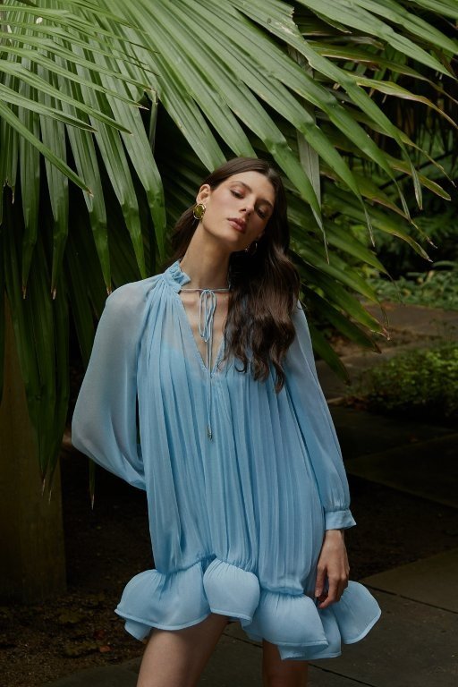 Composta por vestidos midi, mini e longos, macacões, blazers, calças, saias, tops croppeds, blusas e regatas, a coleção ganha força através dos conjuntos, com peças coordenadas que se destacam pelo caimento impecável e pela elegância atemporal. Os materiais escolhidos, como jersey, viscose, algodão, linho, denim e acetato, garantem leveza e movimento, enquanto organza rústica, rendas, laises e guipures agregam um toque artesanal às composições.