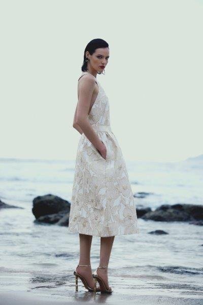 Com base nas comemorações de Natal e Ano Novo, todos os itens caminham em uma cartela em tons de off white, bege, dourado, prata, rosé e bordô. Dentre todas as novidades, o destaque especial está nos dois conjuntos de top e saia desenvolvidos em brocado e em paetê, que se evidenciam pelas suas ricas texturas.