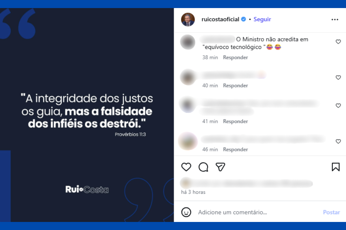 Internautas reagiram à publicação recente de Rui Costa e ironizaram o pedido de desculpas de Geraldo Júnior. "O ministro não acredita em 'equívoco tecnológico', escreveu um. "Olha ele aí, Geraldo Júnior", brincou outro ao mencionar as redes sociais do vice-governador.