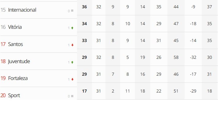 A derrota de 2 a 0 do Santos para o Palmeiras, no Allianz Parque, na última quinta-feira (7), fez o Vitória confirmar a saída da zona de rebaixamento, o que não acontecia desde a 19ª rodada, quase três meses. Agora, o Rubro-Negro é o 16º colocado, com 34 pontos e o Peixe caiu para 17º, com 33. Além do resultado positivo, o Leão também diminuiu as chances de rebaixamento, de acordo com dados da Universidade Federal de Minas Gerais (UFMG).