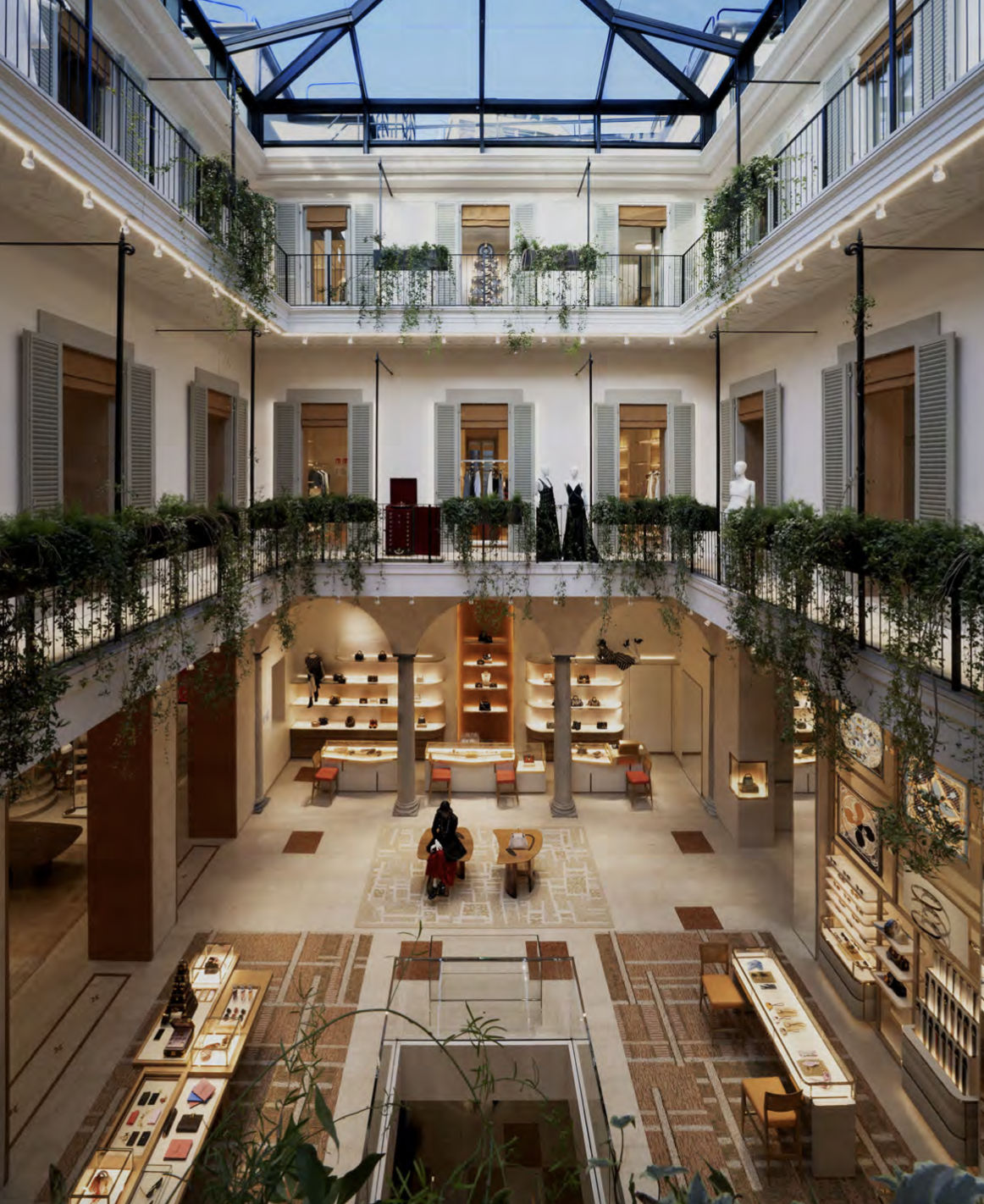 A restauração das paredes permitiu a recuperação dos arcos originais, que foram aprimorados com a adição de perspectiva para aumentar a sensação de profundidade. Todos os móveis foram produzidos em ateliês na Lombardia, enquanto os materiais de tecidos foram pintados manualmente. Entre as mesas, predomina uma atmosfera natural e folhagens verdes, gráficas e aeradas: uma mistura de aspargos (Asparagus Sprengeri) e samambaias (Cyathea Cooperi), cujos ramos leves ondulam com o menor movimento do ar, à medida que os visitantes passam. Os loureiros, podados em formato de arbustos, dispostos em vasos em ambos os lados da entrada sob o pórtico, conferem privacidade. Acima, no pórtico do Palazzo Taverna, as palmeiras-reais (Archontophoenix Alexandrae) são protagonistas na Via Montenapoleone. Todos os vasos foram especialmente projetados, feitos de terracota verde. Toda a vegetação – arbustos, flores e plantas – tanto neste espaço quanto no interior da loja, foi cuidadosamente planejada pelo paisagista milanês Marco Bay.