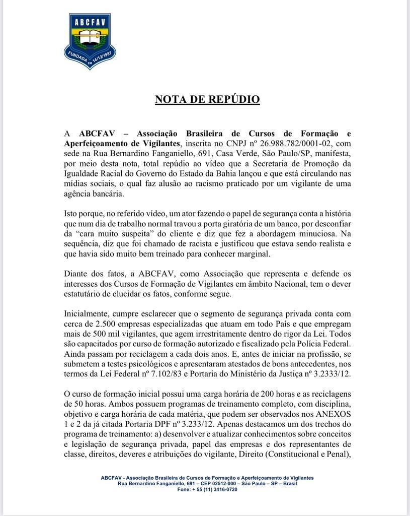 A Associação Brasileira de Cursos e Aperfeiçoamento de Vigilantes (Abcfav) emitiu uma nota de repúdio, nesta sexta-feira (3), criticando o Governo da Bahia sobre uma campanha em que é narrado um por um ator branco, interpretando um segurança, uma abordagem dentro de uma agência bancária. No vídeo (veja abaixo completo), o segurança afirma que abordou uma pessoa porque ele "era bem treinado" e que "vagabundo" não entraria no banco.