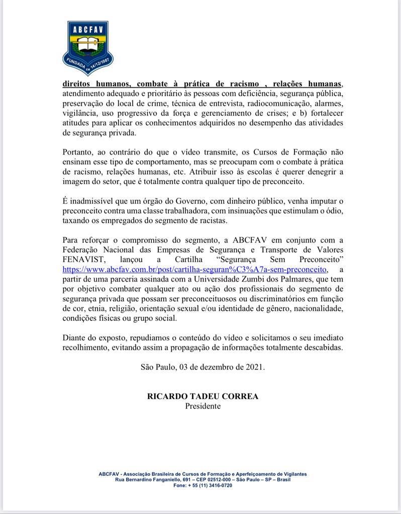 Na nota, a Abcfav afirma que os vigilantes não "ensinam esse tipo de comportamento, mas se preocupam com o combate à prática do racismo, relações humanas, etc" [...] É inadmissível que um órgão do Governo, com dinheiro público, venha imputar o preconceito contra a classe trabalhadora, com insinuações que estimulam o ódio, taxando os empregados do segmento de racistas".