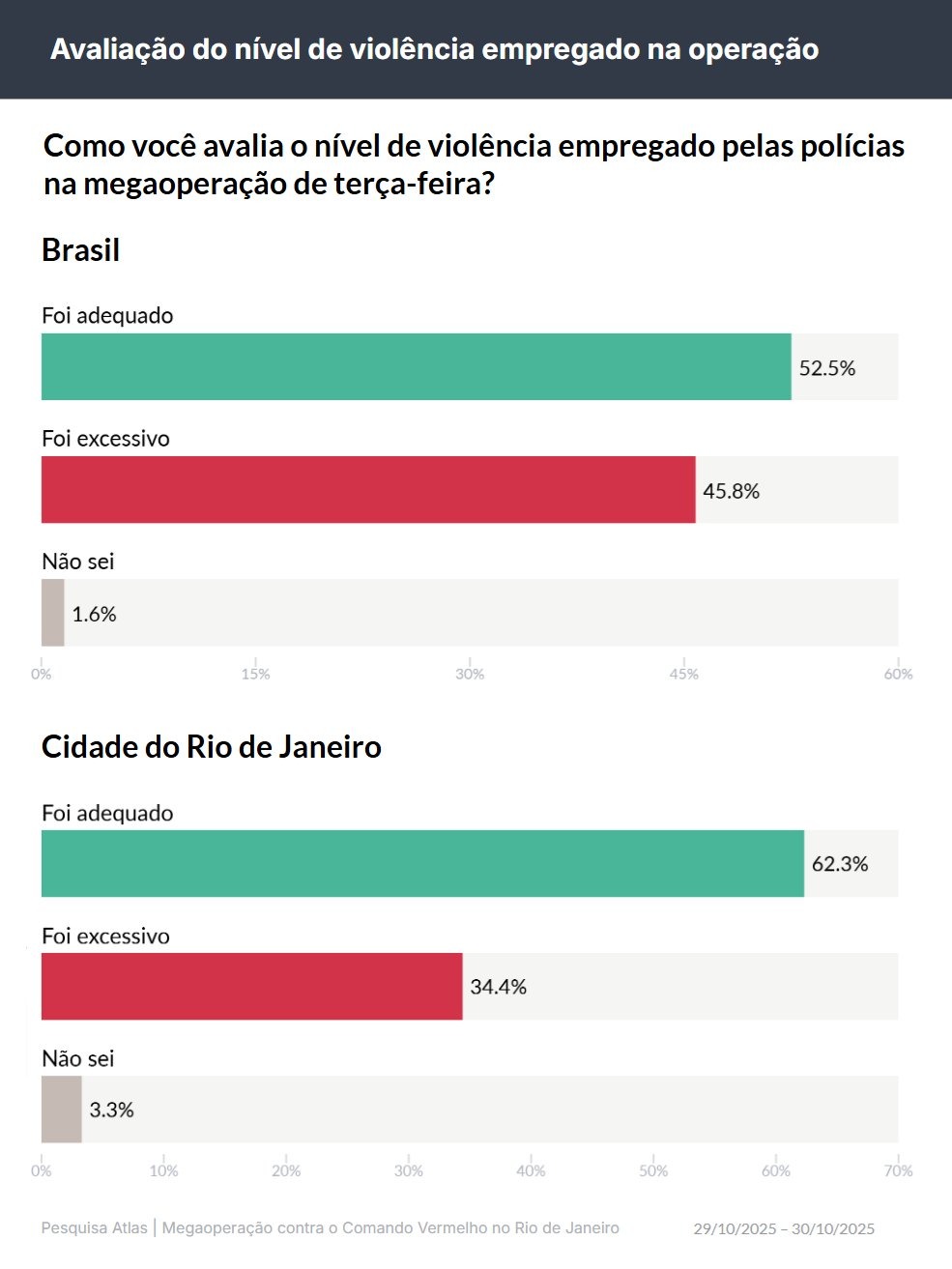 A maioria dos brasileiros (52,5%) classificou como "adequado" o nível de violência empregado por policiais na megaoperação do Rio de Janeiro, na última terça-feira (28). Em contrapartida, 45,8% consideram "excessivo".
