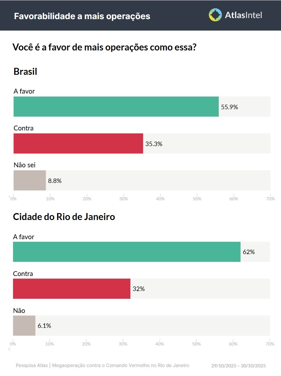 A pesquisa da AtlasIntel ouviu 1.089 pessoas entre os dias 29 e 30 de outubro, através de Recrutamento digital aleatório (Atlas RDR). A margem de erro é de 3 pontos percentuais, para mais ou para menos, e o nível de confiança do levantamento é de 95%.