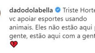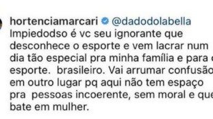 Barraco para animar o domingão! Hortência virou uma fera com um comentário feito por Dado Dolabella na postagem que ela fez comemorando o desempenho do filho na Olimpíada de Tóquio. A ex-jogadora de basquete postou uma foto de João Oliva, que estreou ontem nos jogos no hipismo. "Confederação Brasileira de Hipismo. Melhor nota da história. Meta cumprida. Time Brasil de adestramento em Tóquio. Parabéns, filho, você é muito merecedor. Evoluir sempre. Te amo", escreveu ela. Dado, então, resolveu comentar, lamentando o esporte com animais: "Triste Hortência, você apoiar esportes usando animais. Eles não estão aqui pra gente, estão aqui com a gente". Hortência, rapidamente rebateu."Impiedoso é você, seu ignorante, que desconhece o esporte e vem lacrar num dia tão especial para minha família e para o esporte brasileiro. Vai arrumar confusão em outro lugar porque aqui não tem espaço para pessoas incoerentes, sem moral e que bate em mulher", escreveu ela, para depois completar: "Escolha não temos nós para ouvir tanta bobagem saindo da sua boca".