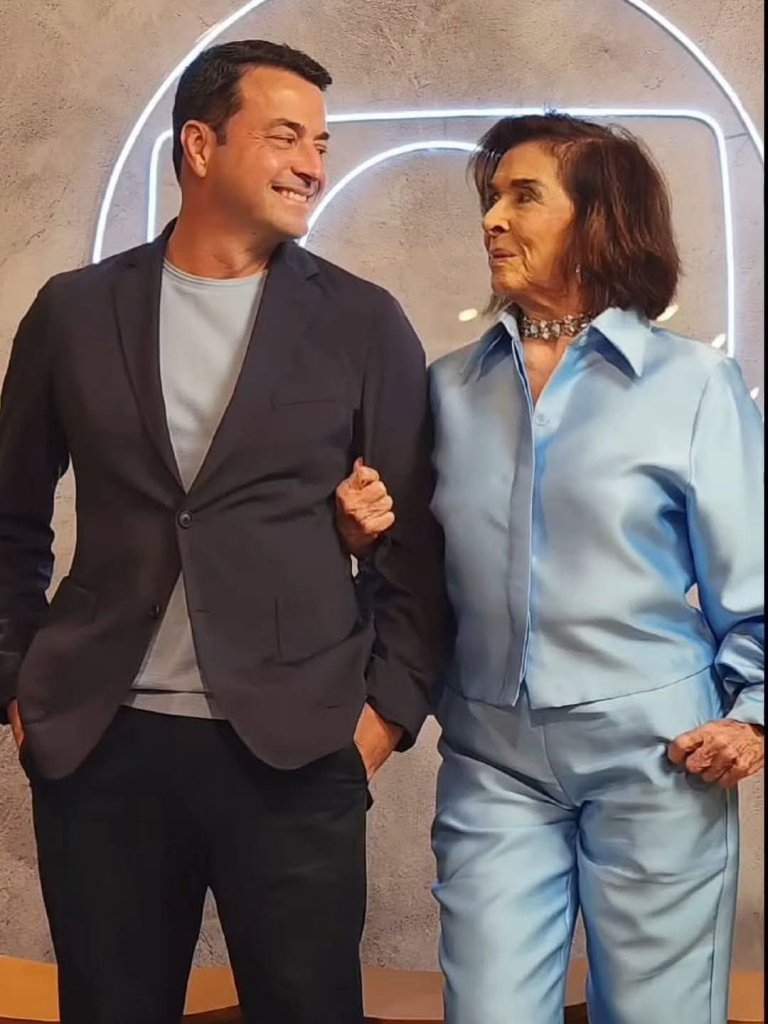 Betty Faria surge belíssima ao lado do filho em gravação na TV Globo