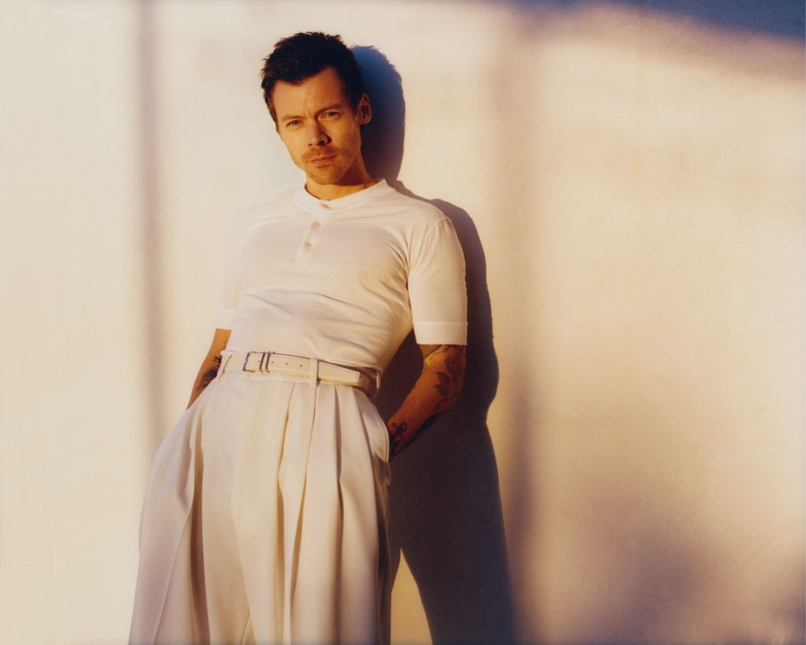 Harry vestiu uma blusa henley branca de malha fina, monocromática, com calça de alfaiataria plissada de lã e um cinto de couro.