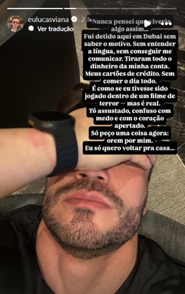 Em outro post, Lucas deu mais detalhes do ocorrido: "Nunca pensei que viveria algo assim... fui detido em Dubai sem saber o motivo. Sem entender a língua, sem conseguir me comunicar. Tiraram todo o dinheiro da minha conta e meus cartões de crédito. Sem comer o dia todo. É como se eu tivesse sido jogado em um filme de terror — mas é real".