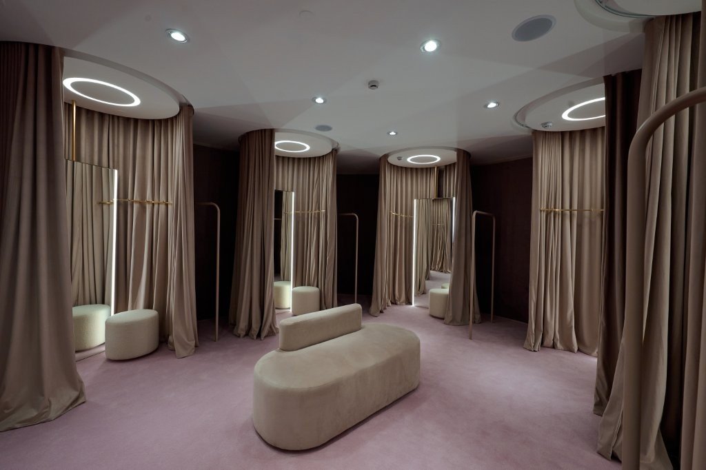 O projeto arquitetônico e de interiores da loja são assinados por Marcelo Passarelli, profissional responsável por todas as unidades da marca. O espaço amplo, acolhedor e clean foi desenvolvido para englobar a cliente na atmosfera CB e proporcionar uma experiência de compra imersiva e exclusiva, característica que a marca preza em todos seus pontos, seja físico ou on-line. O ambiente neutro, com toques sutis de cor, traz leveza sem tirar o foco do produto. Os destaques ficam por conta da pílula central –- uma grande arara onde todas as clientes conseguem interagir e conhecer as peças da label – e do provador de veludo, carpete e luz suave, que cria um clima acolhedor e convida à pausa durante o momento de compra.