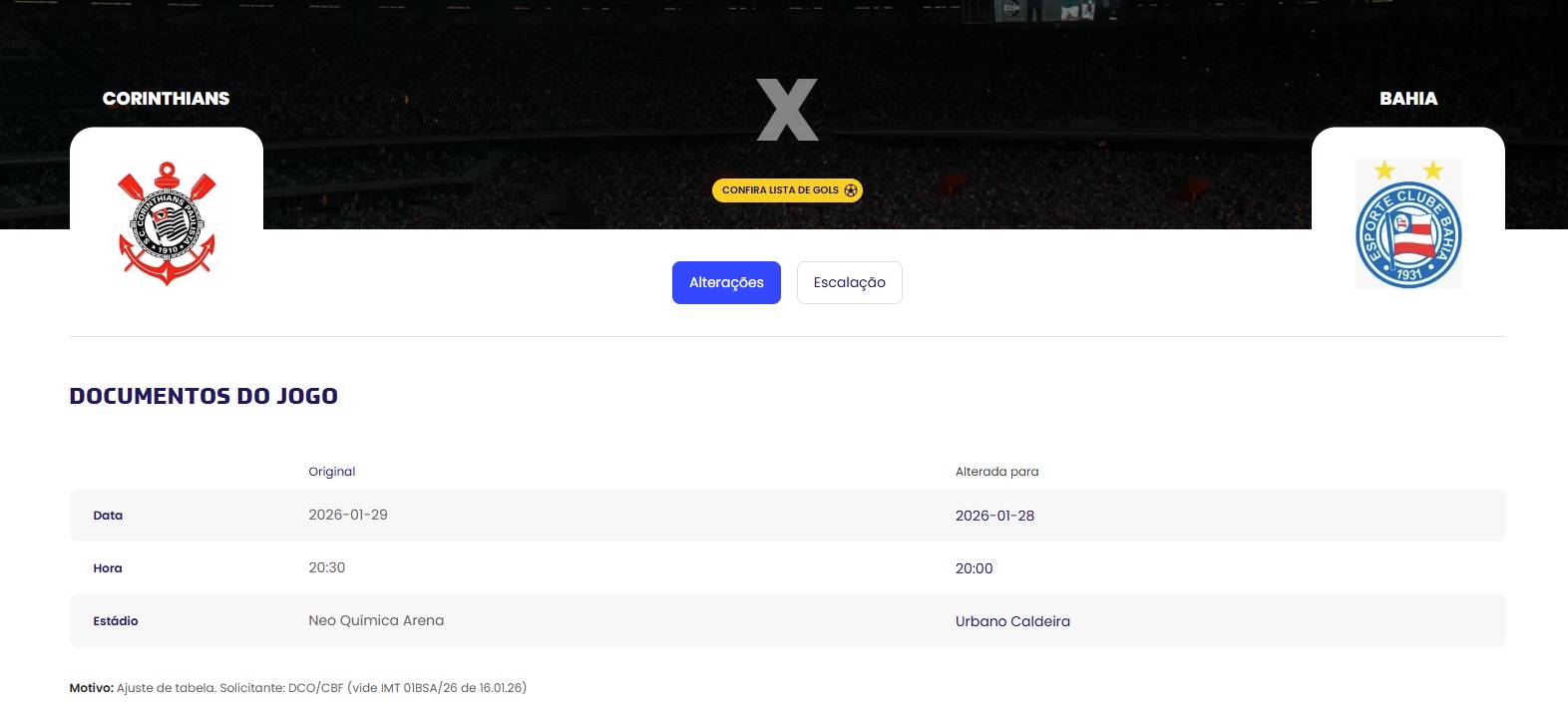 A Confederação Brasileira de Futebol (CBF) confirmou mudanças na estreia do Bahia no Campeonato Brasileiro da Série A de 2026. Inicialmente marcado para quinta-feira (29), o duelo contra o Corinthians foi antecipado para a quarta-feira (28), com início às 20h.