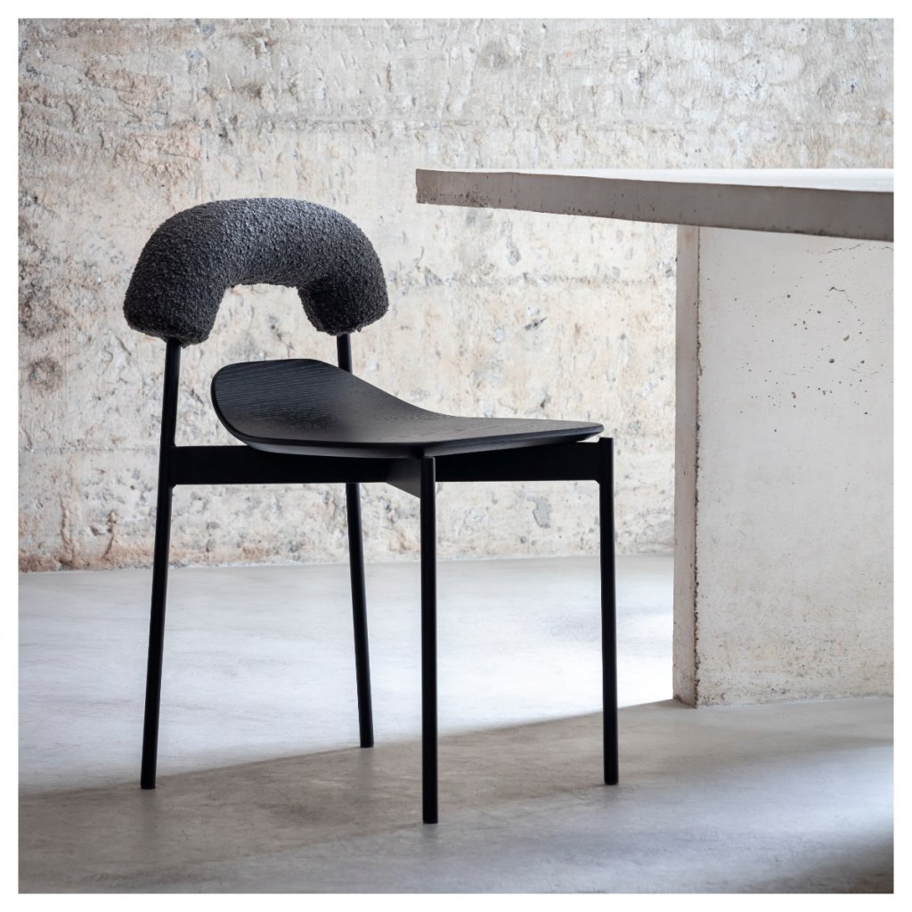 Nada na cadeira é literal. O encosto fechado e curto sugere contenção e invisibilidade. O assento sinuoso acolhe o corpo com ambiguidade, entre conforto e tensão. Os pés posteriores rompem com a lógica da simetria. As proporções desafiam padrões clássicos, instigando o olhar.