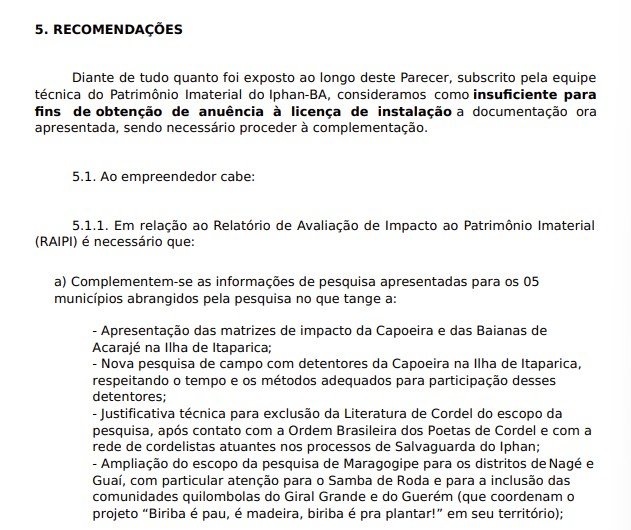 No documento divulgado, o Iphan classificou como insuficientes as pesquisas da SVPonte que avaliam os danos às comunidades tradicionais, e recomendou uma série de ações complementares para emitir parecer favorável à instalação do equipamento. Confira na íntegra: