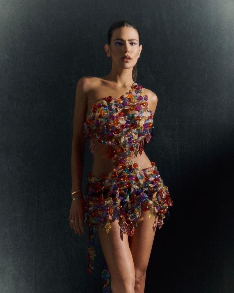 A influencer decidiu fazer do metalizado o grande protagonista de seu look. Valorizando as curvas naturais do corpo, Helena usou um vestido de comprimento mini feito com várias medalhas prateadas, adornado pelo colar, também metalizado, que levava o nome de seu camarote.