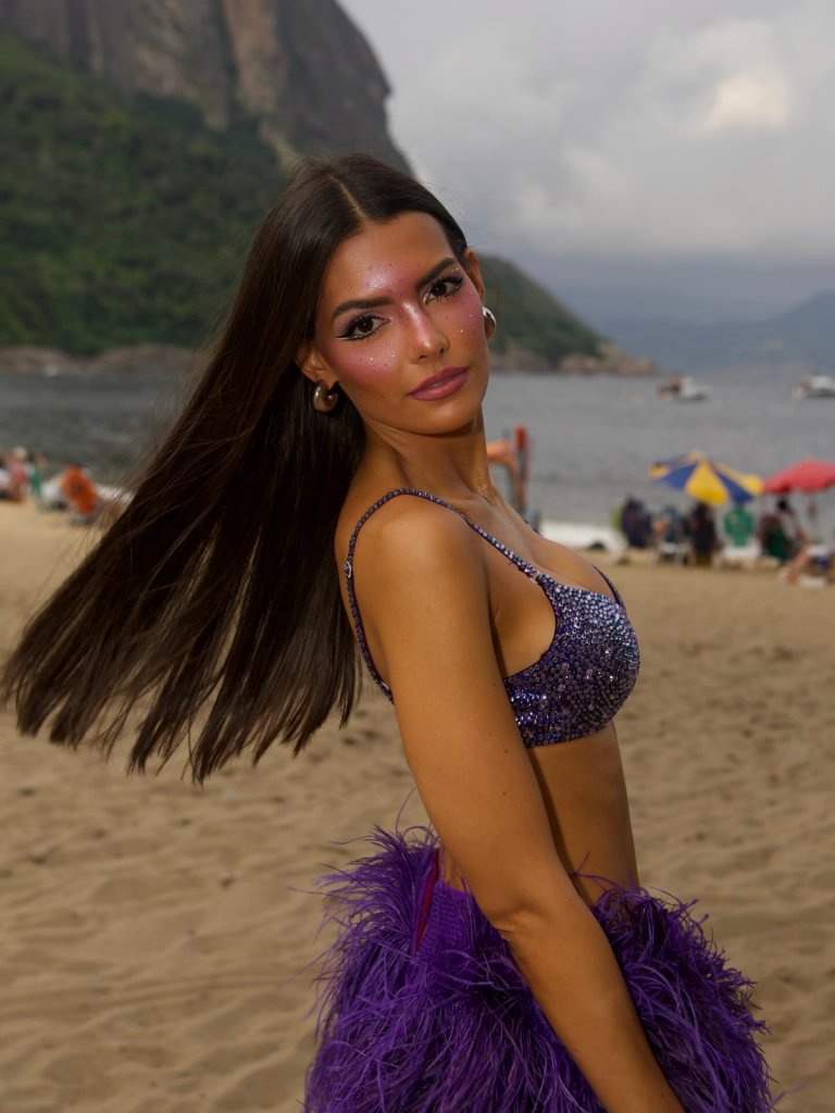 Em um mix de fantasia de cowgirl e estética dos foliões, Sabrina apareceu em um conjunto com aplicações de cristais e franjas que resultaram em um visual chic, divertido e cheio de movimento. A proposta da também Rainha de Bateria incorporou até a manicure ao look, com unhas que levavam o mesmo tom das peças e aplicações de microcristais.