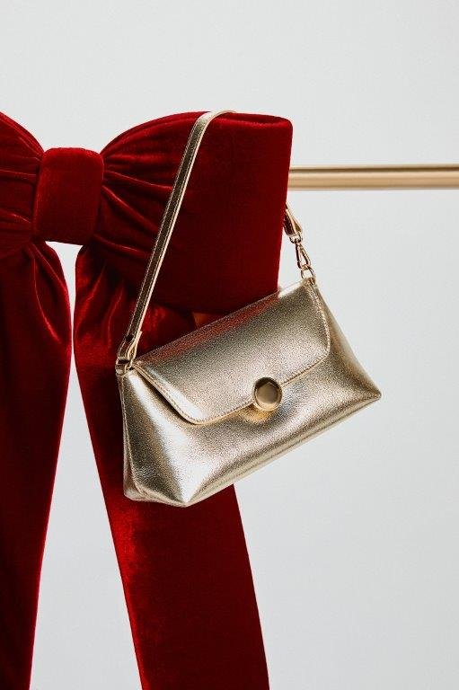 A coleção traz mais de 50 peças, entre elas sandálias de diferentes alturas, rasteiras, scarpins e modelos variados de bolsas. O couro — protagonista da marca — aparece em versões metalizadas e em combinações que reforçam o glamour do período, enquanto amarrações delicadas e superfícies com brilho complementam o estilo expressivo da linha.