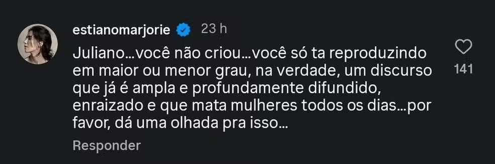 “Juliano… você não criou… você só está reproduzindo um discurso que já é ampla e profundamente difundido, enraizado e que mata mulheres todos os dias”, escreveu a atriz.