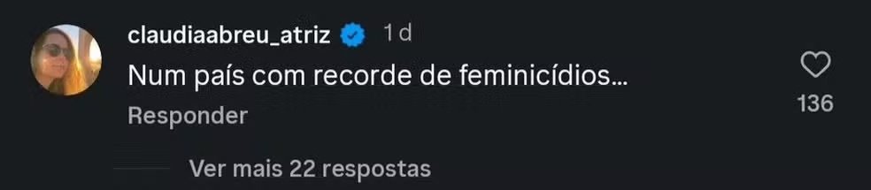 Cláudia Abreu também comentou, destacando o cenário de violência no país: “Num país com recorde de feminicídios...”, afirmou.