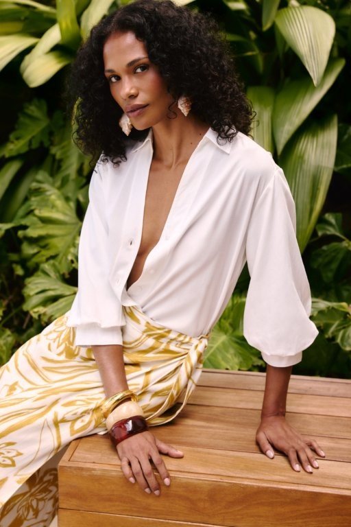 Estampas com flores e folhagens em amarelo vibrante aparecem em linho e viscose, trazendo movimento e naturalidade, enquanto o maxi poá marrom em viscose imprime personalidade a produções festivas. O lurex em tramas delicadas adiciona brilho sutil às blusas de modelagem solta, e as peças brancas em algodão e viscose iluminam os looks de verão.