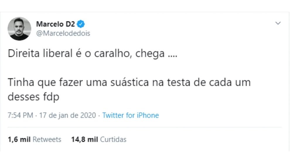 O deputado estadual do Rio de Janeiro, Márcio Gualberto dos Santos (PSL), denunciou neste domingo (19), o músico Marcelo D2 por incitação ao crime. A denúncia foi registrada na 34ª Delegacia de Polícia, no bairro de Bangu, na capital fluminense. O motivo foi uma declaração dada pelo músico em uma rede social. A postagem feita na sexta-feira (17), recebeu mais de 14.800 curtidas.