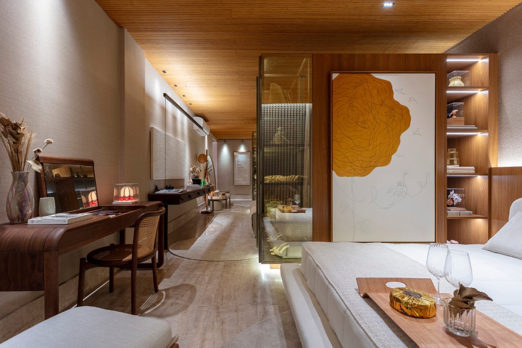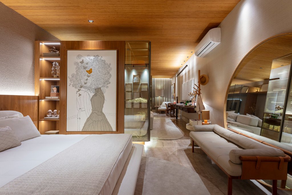 Na Suíte Amar, luxo e cuidado se revelam em cada detalhe. O projeto convida a repensar a intimidade e os limites do convívio, propondo que o encontro também pode acontecer mesmo quando se escolhe outro travesseiro. “No fim, são dois quartos, mas um só coração”, resume Adriane.