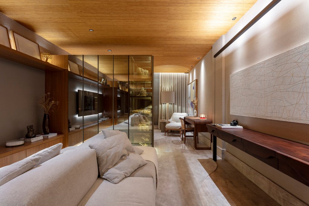 A arquiteta idealizou duas suítes para um só casal, não para separá-lo, mas para valorizar o espaço de reconexão individual. “Um quarto extra não é excesso, é um gesto de amor. Reconhecer que, mesmo separados, continuamos inteiros. Amar também é deixar o outro respirar”, reflete.