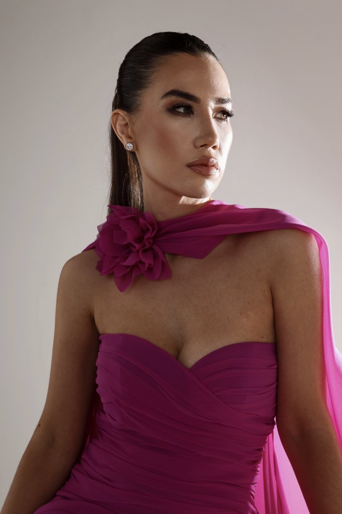 Os dois novos vestidos seguem propostas diferentes. O primeiro, é um modelo longo com design sofisticado e elegante pensado para eventos mais formais. Com corpo estruturado e drapeado, o vestido valoriza a silhueta e conta com um decote em formato de coração. O detalhe floral removível pode ser aplicado tanto próximo ao quadril quanto na echarpe que acompanha o modelo, complementando a proposta leve e esvoaçante da modelagem.