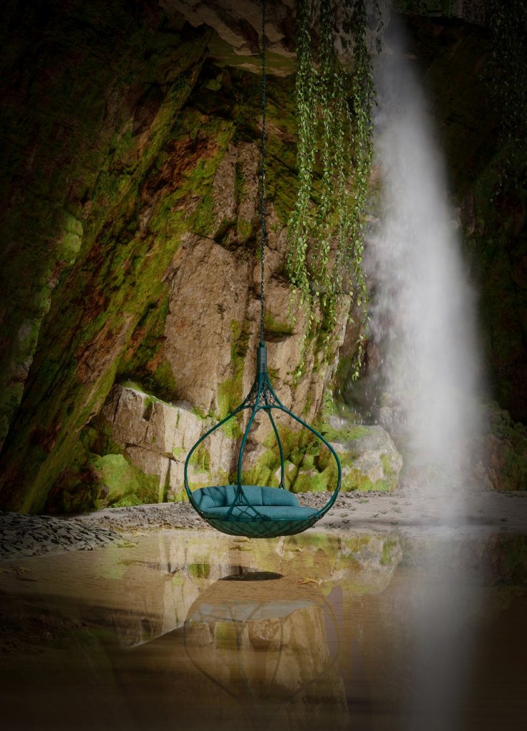 Como uma grande gota d’água suspensa, Luciano quis criar um móvel que passasse a sensação de estar flutuando no ambiente. Com laterais vazadas, o balanço permite uma visão total, integrando a peça ao ambiente e as pessoas ao redor. “Durante o processo de pesquisa e desenvolvimento do design, entendemos que a liberdade era o ponto principal dessa peça”, recorda.