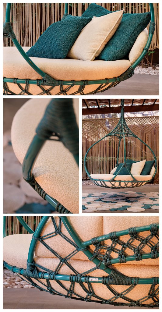 Presença constante nas criações da Tidelli, a natureza surge imponente no grande lançamento da marca para 2024. Assinado por Luciano Mandelli, o Balanço Drop tem desenho que faz referência direta ao mais importante recurso natural do planeta - a água. Um balanço com design fluído e linhas arredondadas. “Foi aplicada uma técnica de Macramê com o ponto chamado Segredo. Ele permite uma flexibilidade criando um handmade super leve”, explica o autor.