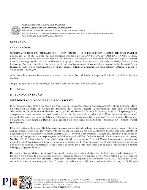 Ao proferir sentença de um processo trabalhista que foi publicado na última quinta-feira (16), o juiz do trabalho Jerônimo Azambuja Franco Neto chamou o atual momento do Brasil de "merdocracia neoliberal fascista".