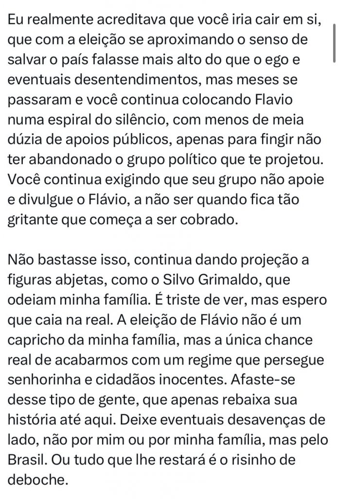 “Você continua exigindo que seu grupo não apoie e divulgue o Flávio, a não ser quando fica tão gritante que começa a ser cobrado. É triste de ver, mas espero que caia na real. A eleição de Flávio não é um capricho da minha família, mas a única chance real de acabarmos com um regime que persegue senhorinha e cidadãos inocentes”, completou.