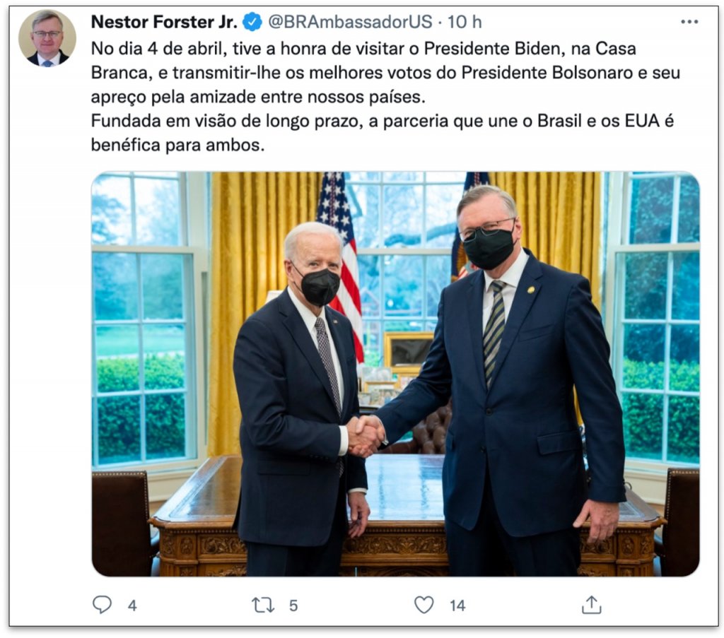 Nestor não detalhou o teor da conversa. Em publicação no Twitter, afirmou que transmitiu a Biden “os melhores votos do Presidente [Jair] Bolsonaro e seu apreço pela amizade entre nossos países”. Forster escreveu que “fundada em visão de longo prazo, a parceria que une o Brasil e os EUA é benéfica para ambos”.