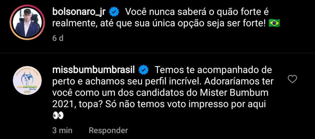 A prova desta conquista veio hoje. O perfil oficial no instagram do concurso Miss Bumbum Brasil fez um convite um tanto quanto inusitado para Renan: a organização oficializou através de um comentário em um dos posts do novo influencer o convite para que Renan participe da primeira edição do Mister Bumbum, que acontecerá ainda esse ano. Segundo o concurso, Renan tem um “perfil incrível”, o que seria ideal para o concurso. Ainda no comentário, o concurso brincou que as votações não são decididas por voto impresso. Será que teremos Renan Bolsonaro como um dos candidatos do Mister Bumbum?
