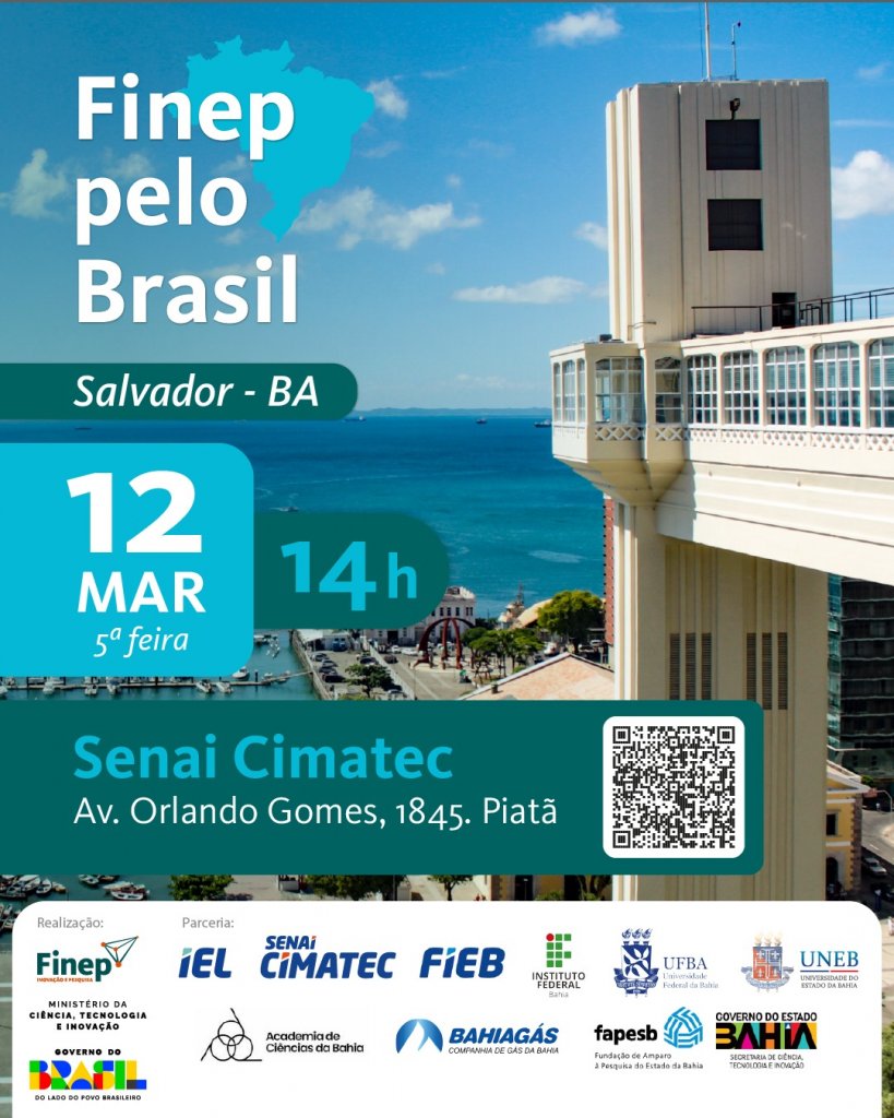 A Finep (Financiadora de Estudos e Projetos), o Ministério da Ciência, Tecnologia e Inovação (MCTI) e o Senai Cimatec realizam, nesta quinta-feira (12), em Salvador, mais uma etapa do programa ‘Finep pelo Brasil’. A iniciativa aproxima do ecossistema de inovação do Nordeste instrumentos de financiamento, como crédito e recursos não reembolsáveis (subvenção econômica), com o objetivo de ampliar e simplificar o acesso de empresas de todos os portes e setores, cooperativas e instituições científicas e tecnológicas (ICTs) às linhas de apoio oferecidas pela Finep.