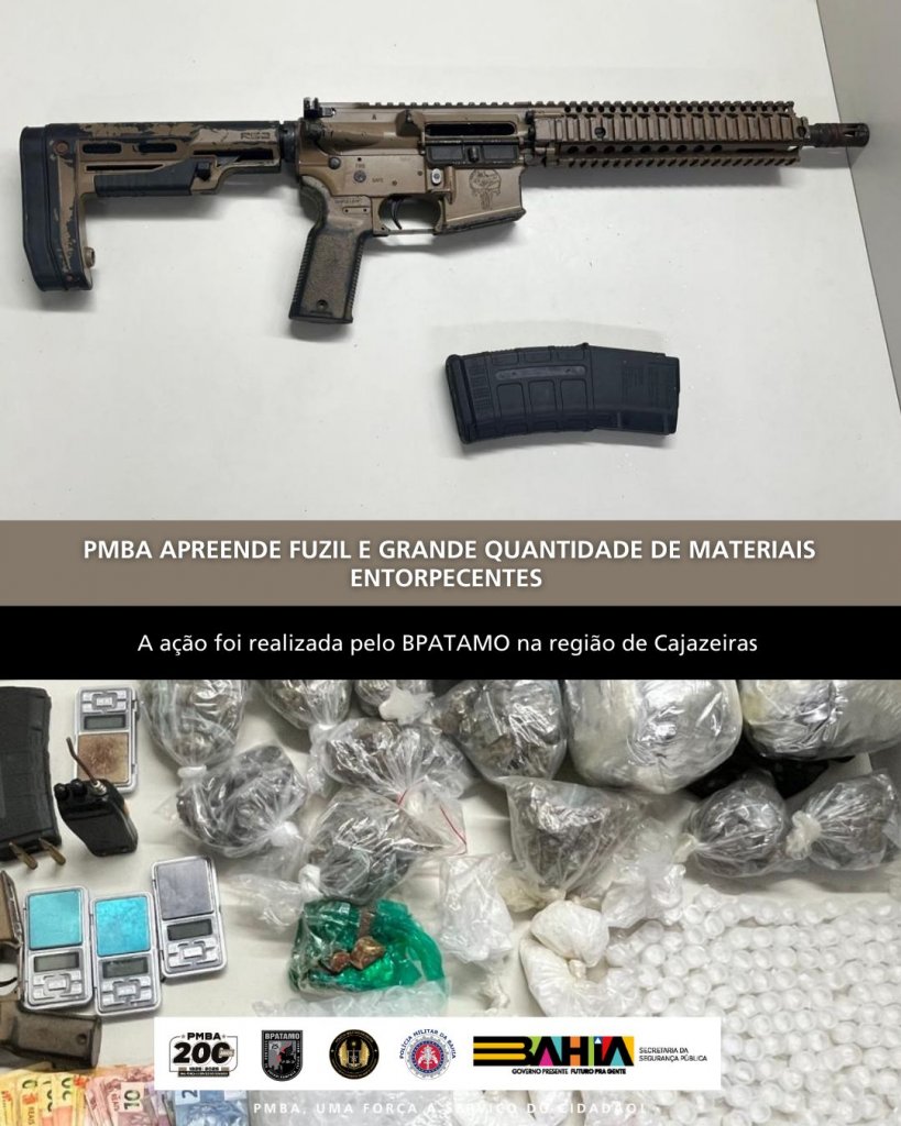 Um fuzil e entorpecentes foram apreendidos por agentes do Batalhão de Patrulhamento Tatico Móvel da Polícia Militar da Bahia (BPatamo), na noite de sexta-feira (5), no bairro de Boca da Mata, em Salvador.