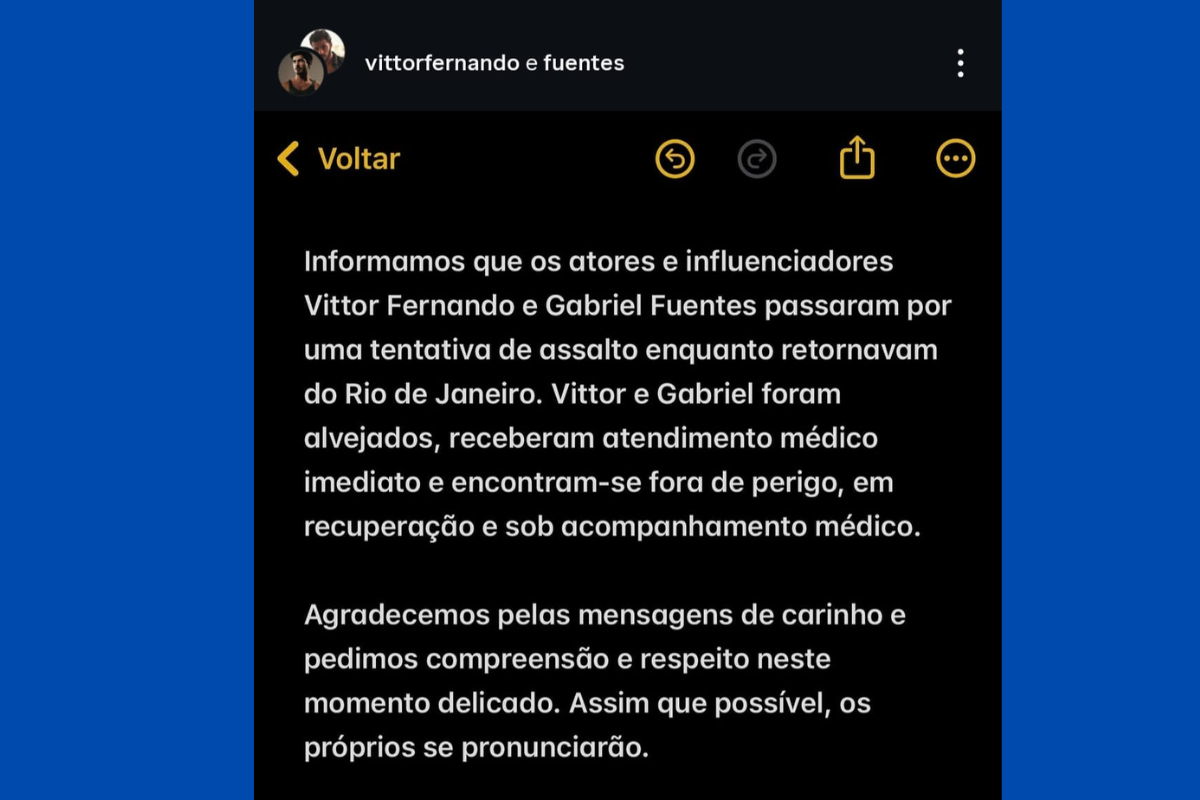 AAssessoria dos artistas divulgou nota sobre tentativa de assalto | Foto: Reprodução/Redes Sociais