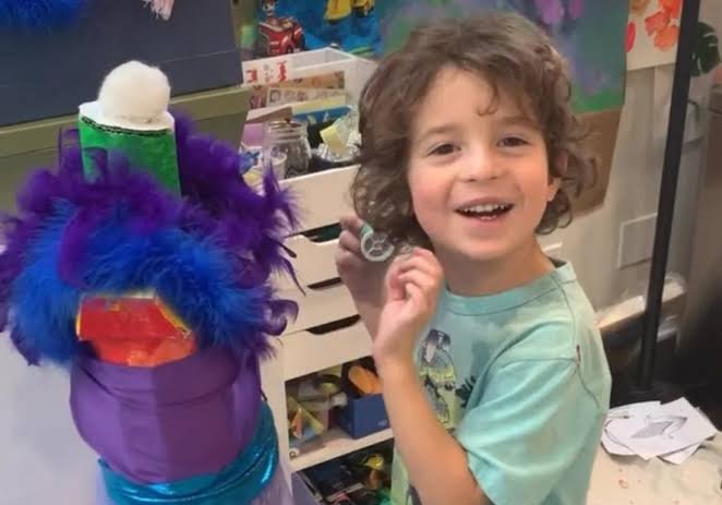 O garoto criou para a estrela de Hollywood Sharon Stone uma peça que ele chamou de "O casaco voador Shmarshmallow"