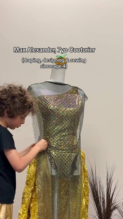 Pasmem! Um garoto de apenas 8 anos, disse que foi Gucci na vida passada. O sucesso é tanto que ele lançou sua própria marca. Max Alexander é da Califórnia (EUA), e se apaixonou pelo mundo da moda desde cedo. Já aos quatros anos começou a fazer vestidos e sempre dizia para sua família que se tornaria costureiro. Seus primeiros desenhos, antes de costurar, eram de fitas, filme plástico e retalhos de tecidos. A fama veio e, em 2021, Max lançou sua primeira coleção em um desfile em Los Angeles e chegou a fazer para a estrela de Hollywood Sharon Stone uma peça que ele chamou de "O casaco voador Shmarshmallow". As referências do garoto combinam estampas tropicais com enfeites de alta costura, além do oceano e ondas. Max recebe o apoio dos pais, principalmente da mãe, que é artista plástica e incentiva bastante o filho. Segundo sua mãe, seus avós estavam no ramo da indústria da moda em Montreal, Canadá. “Meus avós e minha mãe eram todos costureiros, mas Max não sabia de nada disso, surgiu do nada”. .1.jpg)