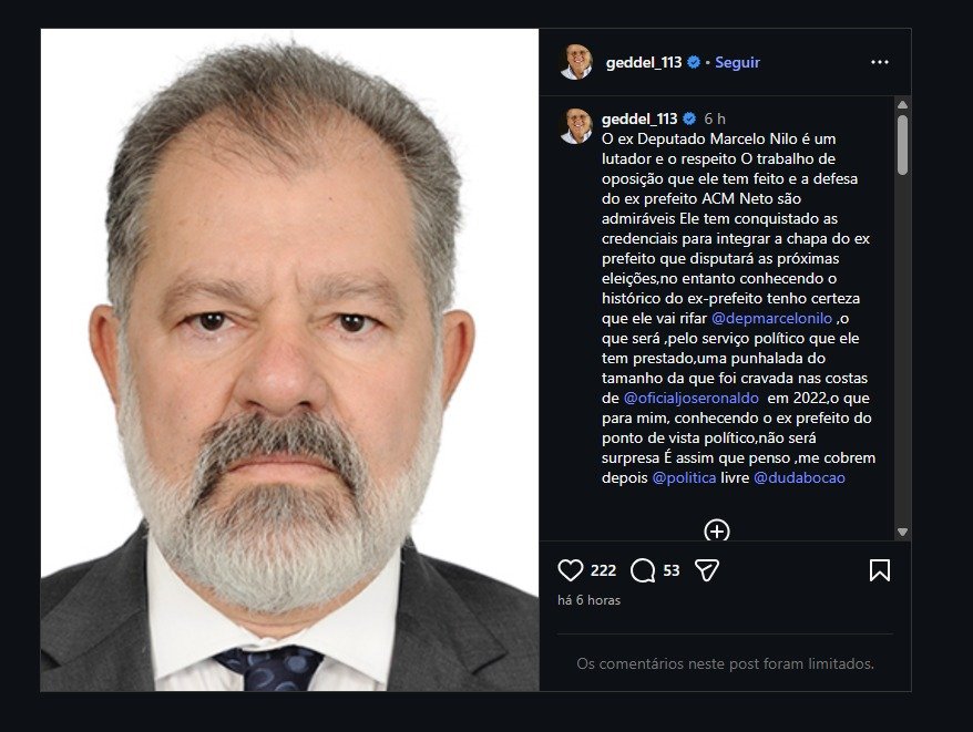 Em publicação nas redes sociais, Geddel, que integra a base governista estadual, elogiou o papel de Nilo como opositor, mas destacou o histórico de ACM Neto na formação de alianças e chapas.