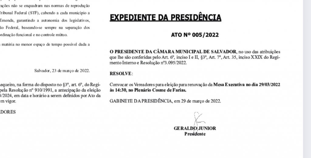 O presidente da Câmara de Vereadores, Geraldo Júnior (MDB), convocou uma sessão para escolher a nova Mesa Diretora nesta terça-feira (29). A convocação ocorre após alterações na Lei Orgânica do Município e a possibilidade de reeleição do chefe da Casa.