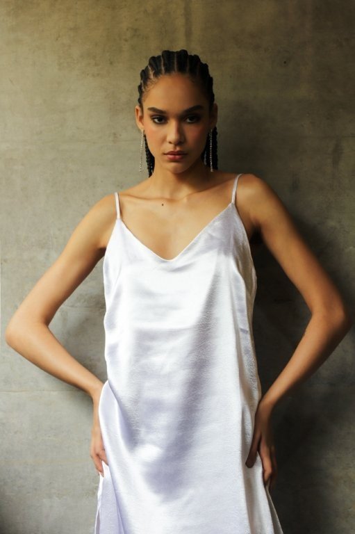 Nos tecidos acetinados, o brilho líquido do cetim reflete a essência de Lumina. Os vestidos Darya (um ombro só) e Yasmin (slip dress longo) são criações que impressionam sem esforço — leves, sutis e ideais para ocasiões especiais.