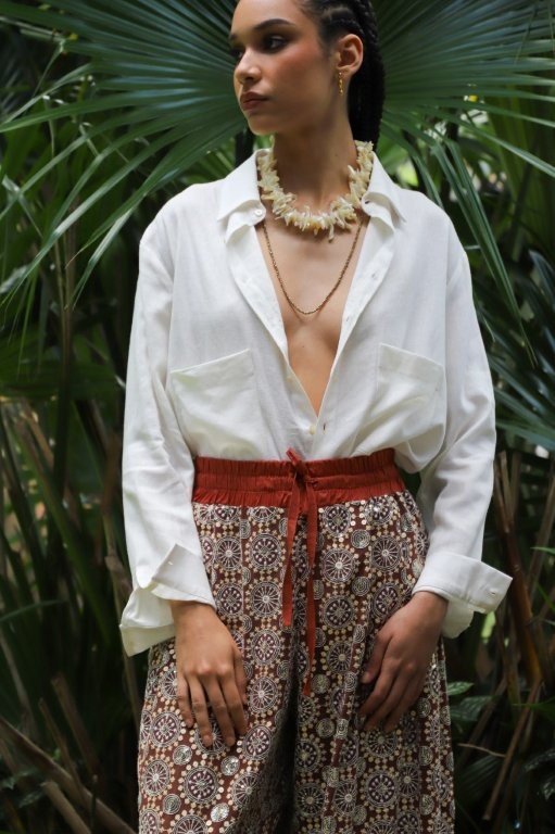 Entre os destaques do drop, o Vestido Naya Bordado surge em três versões — preto, argila e off-white, esta última sendo ideal para produções de Ano-Novo, mas igualmente versátil para festas diurnas, resorts e ocasiões despretensiosas. A silhueta fluida com corpo liso e saia bordada ganha movimento e um toque artesanal com a barra de franjas longas, criando um efeito sofisticado e único. Já a Calça Bordada Índia, também em off-white, foi desenvolvida para brincar com luz e textura, tem caimento leve, cós confortável e shape que já virou assinatura da Inglesis. É uma peça especial que se adapta tanto a ambientes casuais quanto sofisticados, resultando em um look monocromático luminoso quando combinada à camisa de seda