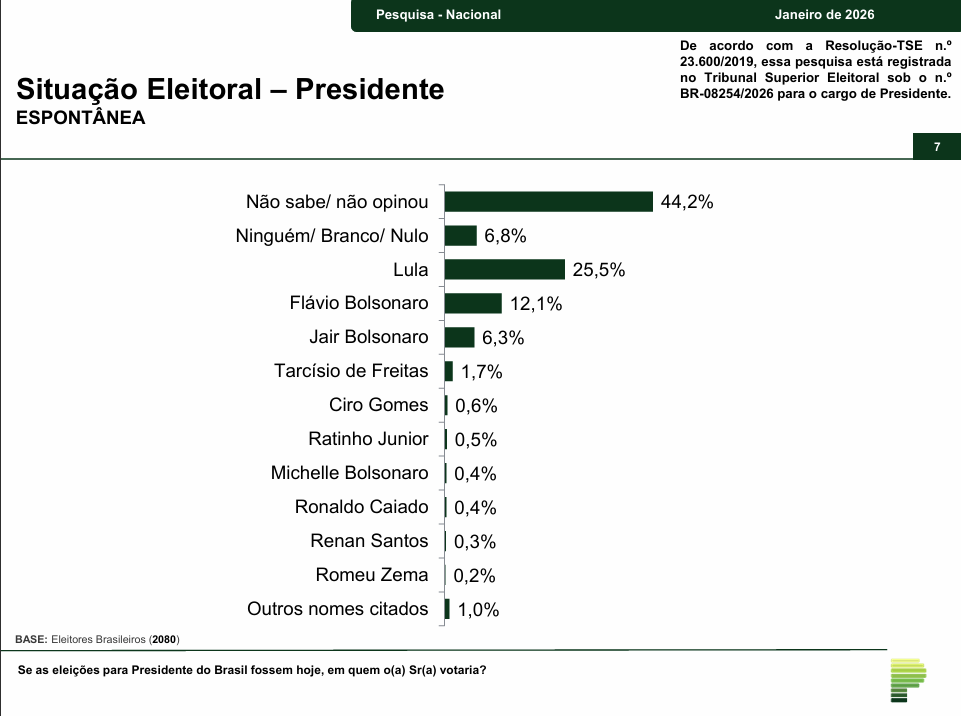 Na consulta espontânea, Lula também lidera com 25,5% das intenções de voto, mas é seguido por Flávio Bolsonaro (12,1%) e Jair Bolsonaro (6,3%). Neste caso, 44,2% dos participantes não souberam responder.