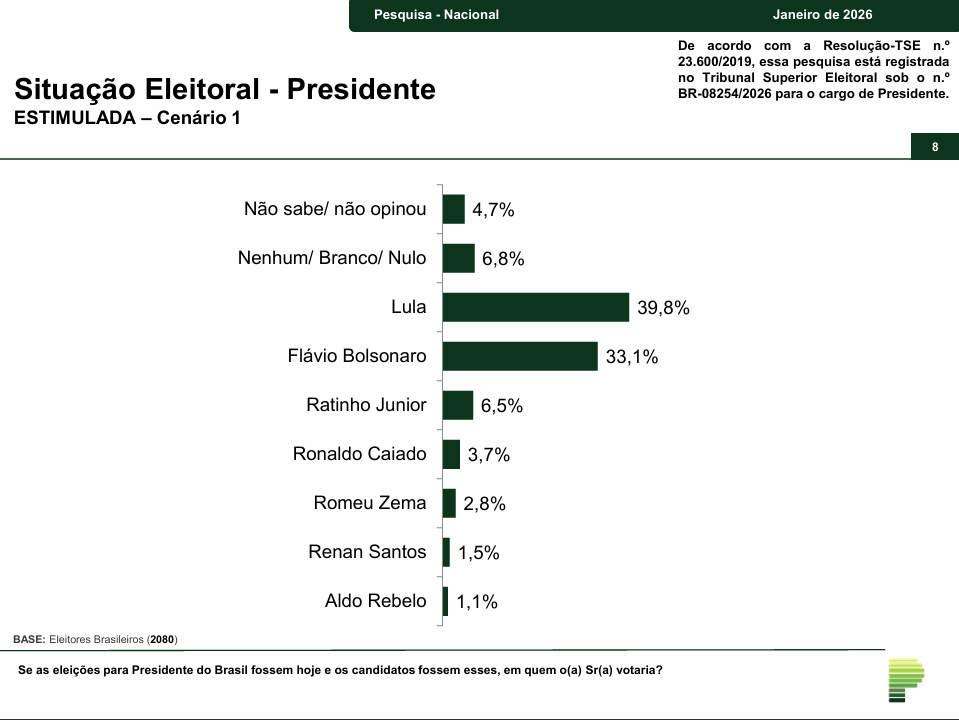 No primeiro cenário estimulado do primeiro turno, em que o representante da direita é Flávio Bolsonaro (PL), Lula lidera com 39,8% das intenções de voto contra 33,1% do candidato bolsonarista. Esta vantagem está fora da margem de erro de 2,2 pontos percentuais para mais para menos.