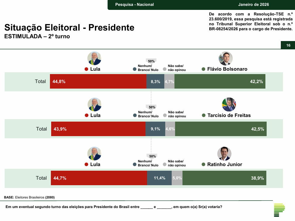 Em caso do segundo turno, Lula também tem vantagem contra Ratinho Junior, mas apresenta empate técnico com Flávio Bolsonaro e Tarcísio de Freitas.