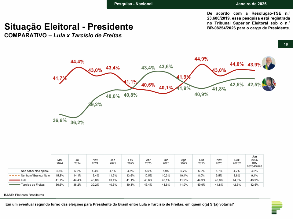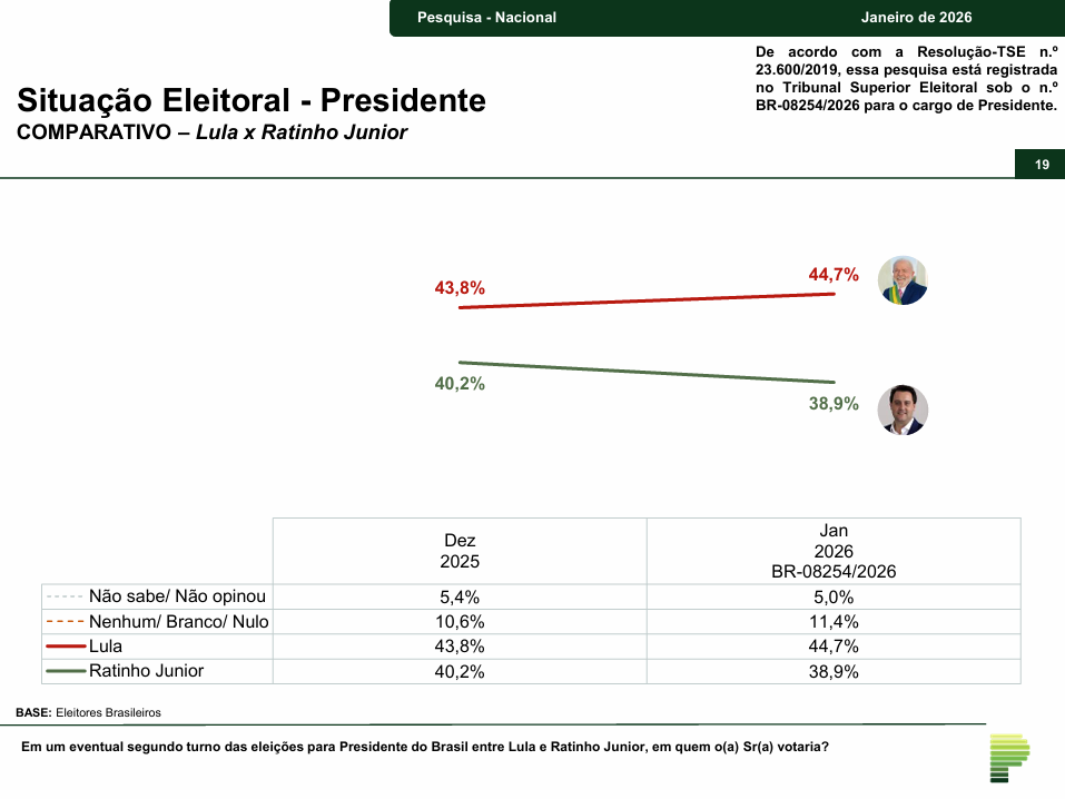 O presidente Luiz Inácio Lula da Silva lidera todos os cenários do primeiro turno nas eleições presidenciais de 2026, mas apresenta empate técnico com os outros candidatos no segundo turno, de acordo com o levantamento divulgado nesta quinta-feira (29) pelo Instituto Paraná Pesquisas.