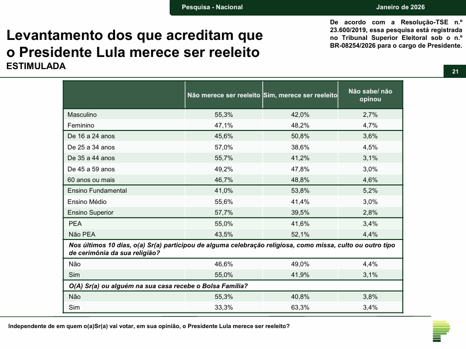A pesquisa ainda mostrou que a região Nordeste é a que mais acredita que Lula merece ser reeleito, como 57,1% de aprovação, enquanto a região Sul do país é a que mais eleitores afirmam que o presidente não merece ser reeleito, com 58,1%.