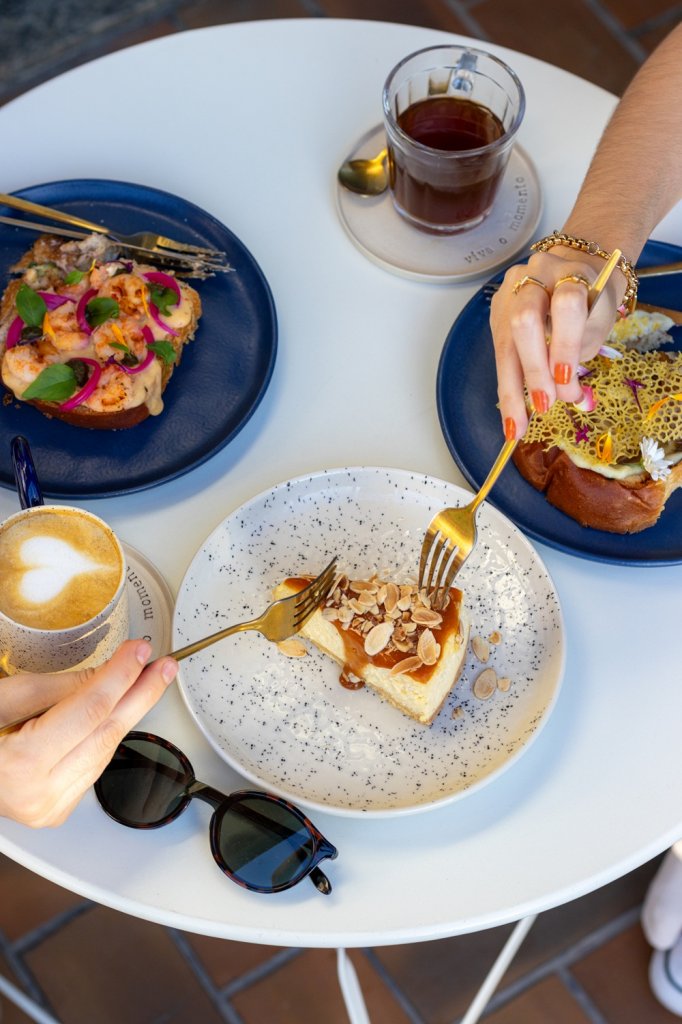 Na linha de toasts, a confeitaria oferece duas novas opções. O Toast Primavera vem no brioche de fermentação natural com creme de gorgonzola, pera caramelizada, tuile de pólen e mel de abelhas nativas sem ferrão e o Toast Camarão vem no mesmo pão, com creme de queijo, camarões refogados, picles de cebola roxa e molho pesto.
