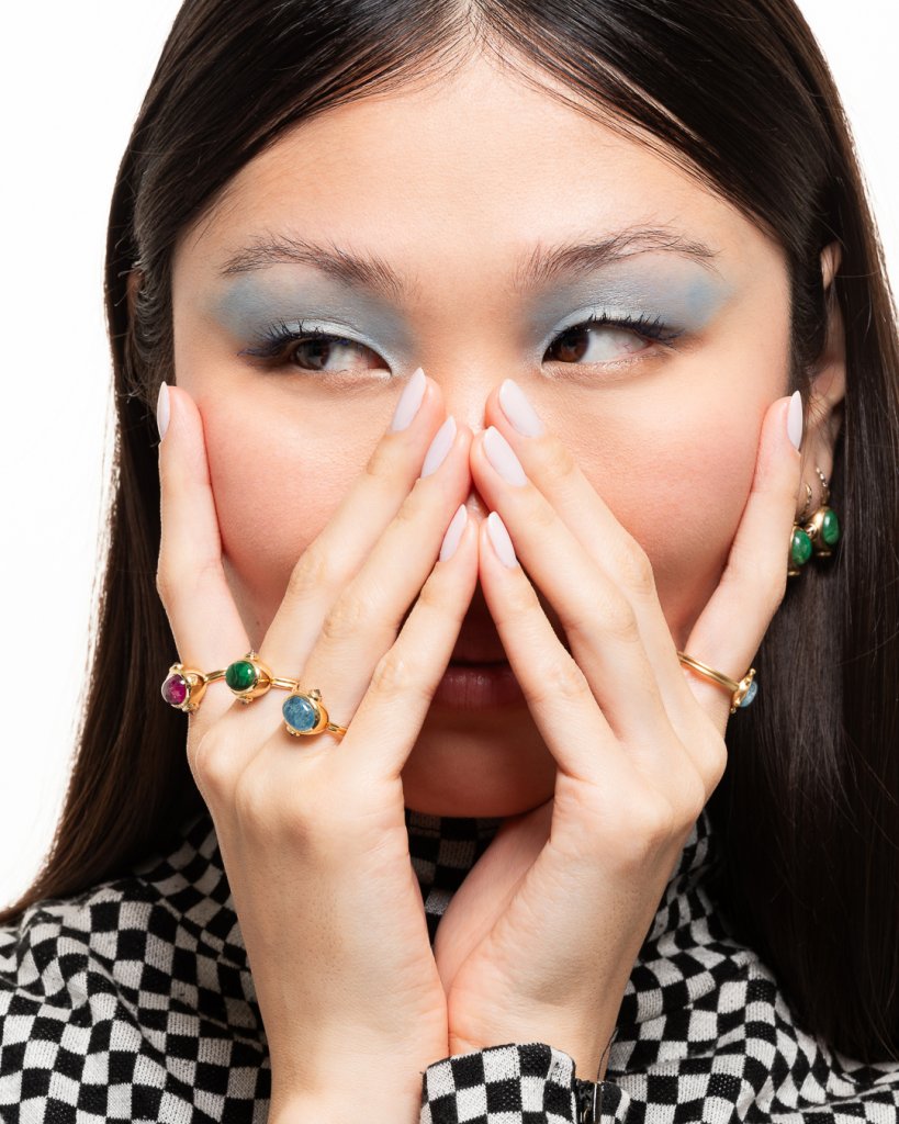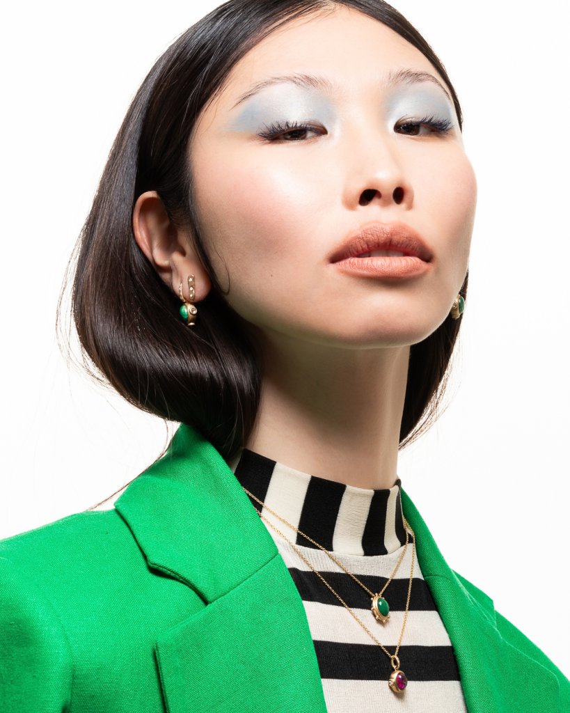 Para a primeira coleção da marca desenvolvida toda em ouro amarelo 18K, a Tejat Studio aposta em pedras nobres coloridas feitas em lapidação cabochon, técnica que foi muito utilizada por grandes nomes da joalheria como Rene Boivin, Suzanne Belperron e Marina Bulgari, e que tem como diferencial a maneira como são escovadas, de forma que não fiquem riscadas e facetadas, trazendo um mood vintage para as peças.